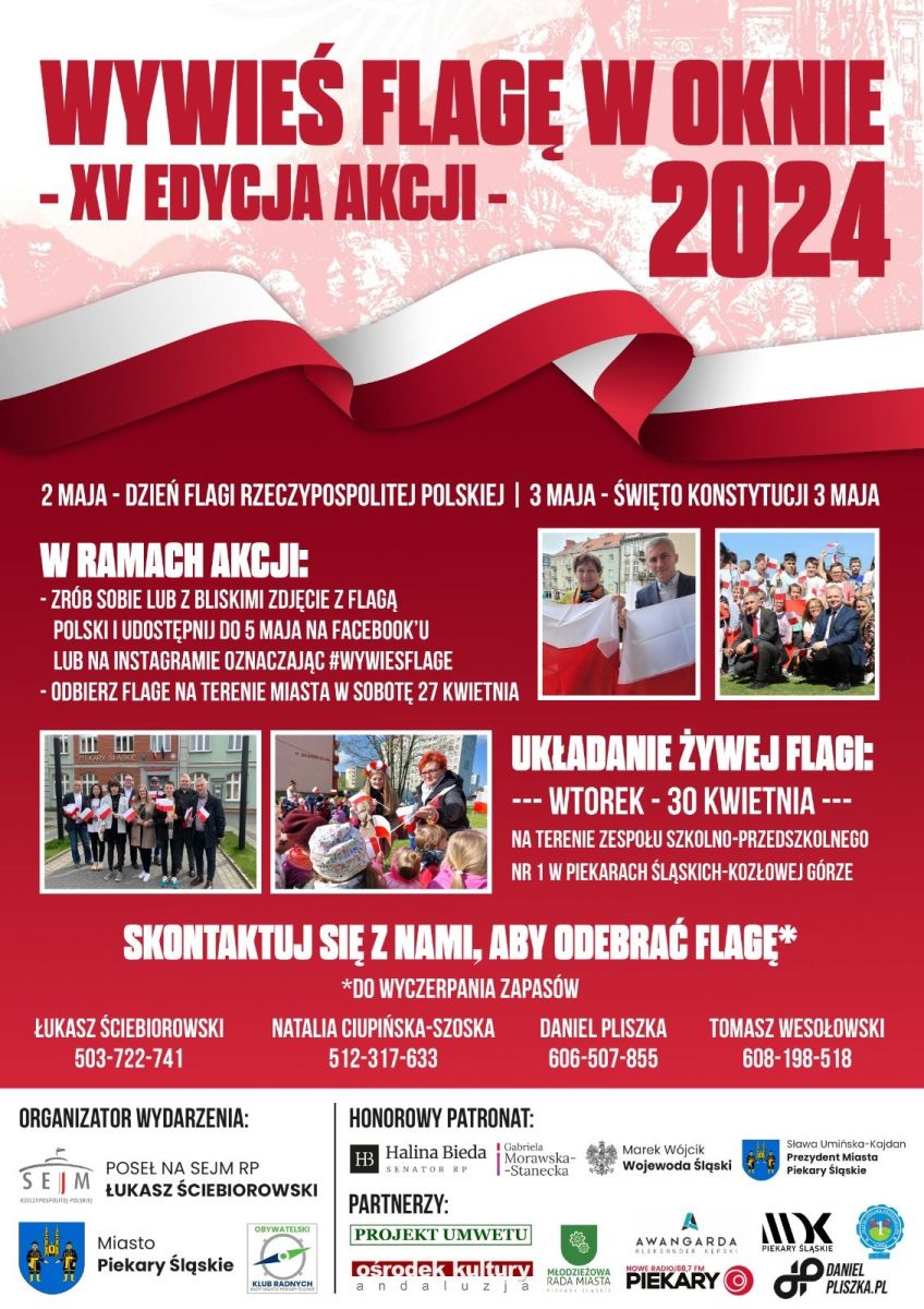 – Organizując akcję po raz pierwszy w Piekarach Śląskich w roku 2010 nie spodziewaliśmy się, że uda nam się co roku nieprzerwanie zapraszać mieszkańców do radosnego obchodzenia świąt majowych w ten właśnie sposób. Chcemy, żeby polskie symbole narodowe, jak właśnie flaga potrafiły nas jednoczyć nie tylko od święta. Nawet jeśli się różnimy światopoglądowo, warto, żeby takie hasła jak Ojczyzna, patriotyzm, flaga, godło, hymn pięknie nas jednoczyły wokół ważnych spraw. Niech akcja Wywieś Flagę w Oknie jest takim przyczynkiem do zastanowienia się nad tym co ważne dla Polski, ale i naszego regionu, miasta – mówi poseł Łukasz Ściebiorowski, jeden z głównych inicjatorów akcji.