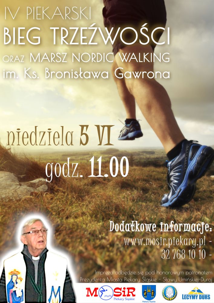 W niedzielę 5 czerwca odbędzie się IV Piekarski Bieg Trzeźwości oraz Marsz Nordic Walking im. Ks. Bronisława Gawrona. Bieg rozpocznie się o godz. 11 00 na stadionie piekarskiego MOSiR-u przy ul. Olimpijskiej 3. Uczestnicy rywalizacji będą mieć do pokonania dystans około 3,5 km. Trasa biegu poprowadzi przez las Dioblina.