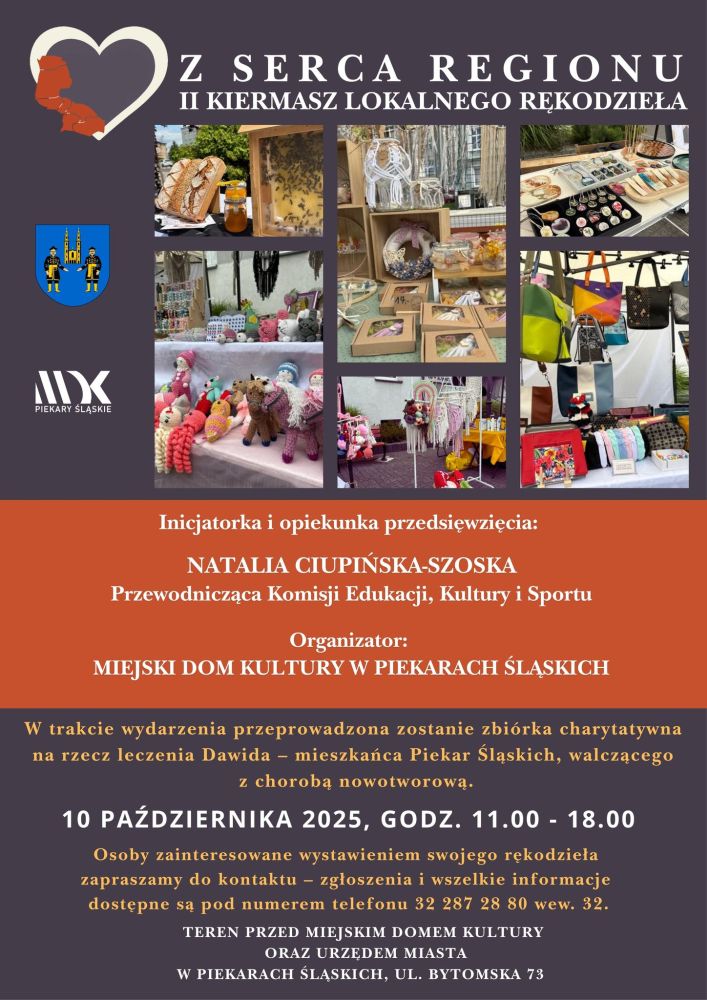 Podczas wydarzenia będzie można podziwiać i zakupić wyjątkowe wyroby lokalnych twórców – od rękodzieła artystycznego, po smakowite specjały. W trakcie kiermaszu przeprowadzona zostanie zbiórka charytatywna na rzecz leczenia Dawida – mieszkańca Piekar Śląskich, walczącego z chorobą nowotworową. Inicjatorką i opiekunką przedsięwzięcia jest Natalia Ciupińska-Szoska – Przewodnicząca Komisji Edukacji, Kultury i Sportu, a organizatorem wydarzenia – Miejski Dom Kultury w Piekarach Śląskich przy wsparciu Urzędu Miasta w Piekarach Śląskich.