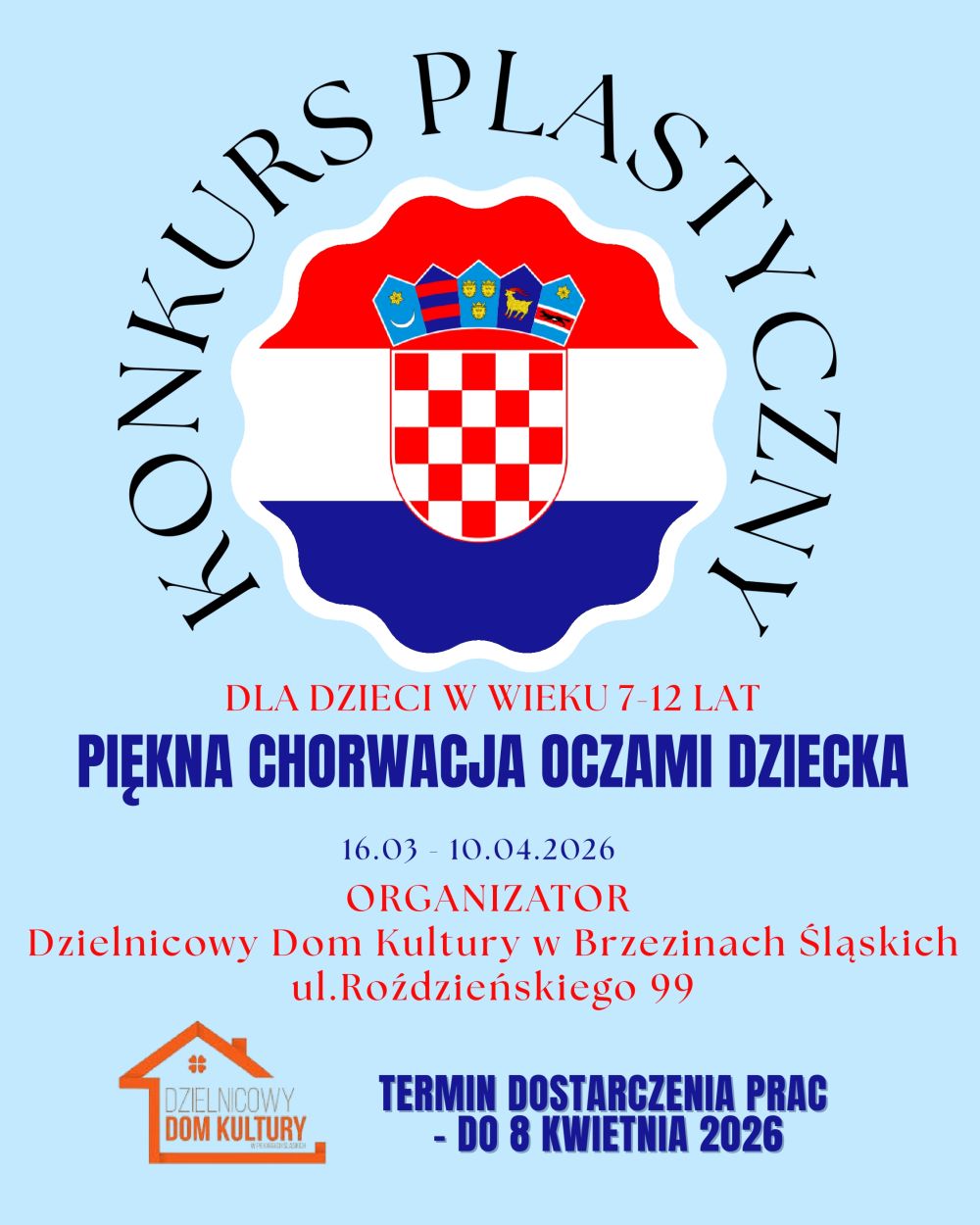 Dzielnicowy Dom Kultury w Brzezinach Śląskich zaprasza dzieci w wieku od 7 do 12 lat do udziału w konkursie plastycznym poświęconym urokom Chorwacji. Wydarzenie organizowane w ramach obchodów Dnia Przyjaźni Polsko-Chorwackiej ma na celu rozwijanie kreatywności oraz przybliżenie najmłodszym kultury i tradycji tego kraju. Prace wykonane dowolną techniką, taką jak rysunek czy plakat, należy dostarczyć do siedziby organizatora przy ulicy Roździeńskiego 99 do 8 kwietnia. Rozstrzygnięcie konkursu oraz wręczenie nagród i pamiątkowych dyplomów zaplanowano na 10 kwietnia.