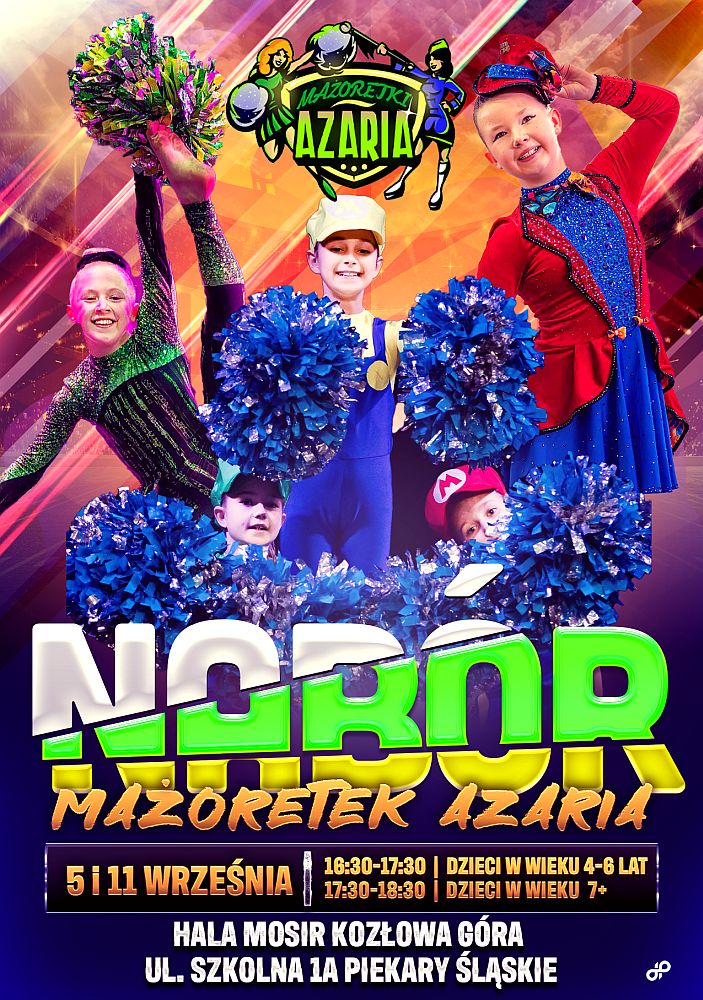 Piekarskie Mażoretki Azaria ogłaszają nabór do nowych grup! Już 5 i 11 września 2025 roku w hali MOSiR Kozłowa Góra przy ul. Szkolnej 1a w Piekarach Śląskich odbędą się spotkania otwarte dla dziewczynek, które chciałyby rozpocząć swoją przygodę z tańcem mażoretkowym.