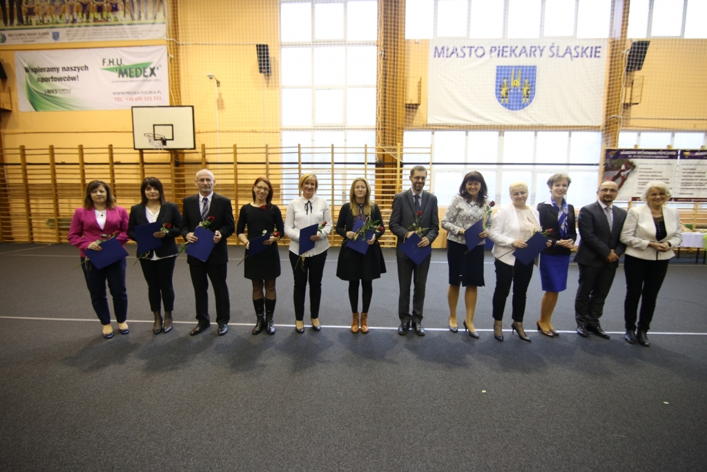 Uroczystość odbyła się w hali MOSiRu, gdzie na co dzień swoje mecze rozgrywa Olimpia Piekary Śląskie. Miejsce wybrano nieprzypadkowo, ponieważ z okazji obchodów chciano przynajmniej w symboliczny sposób uhonorować wszystkich piekarskich nauczycieli. Stąd też każdy z nich otrzymał różę, którą wręczali m.in. wiceprezydent Piekar Krzysztof Turzański oraz radny Łukasz Ściebiorowski. Na uroczystości byli również obecni: Wiceprzewodnicząca Rady Miasta Gabriela Kossakowska, poseł Jerzy Polaczek oraz prezes piekarskiego koła Związku Nauczycieli Polskich Małgorzata Morawiak-Szysler.