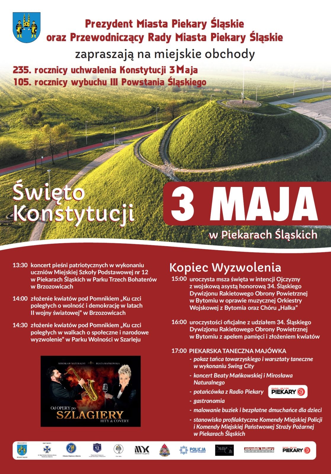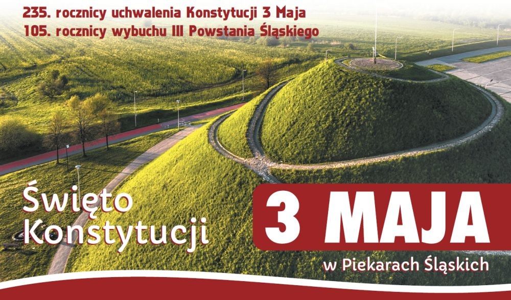 Sława Umińska-Kajdan – Prezydent Piekar Śląskich i Tomasz Wesołowski – Przewodniczący Rady Miasta zapraszają na miejskie obchody 235. rocznicy uchwalenia Konstytucji 3 Maja i jednocześnie 105. rocznicy wybuchu III Powstania Śląskiego. Po oficjalnych obchodach u stóp Kopca Wyzwolenia zapraszamy na “Piekarską Majówkę Taneczną”.