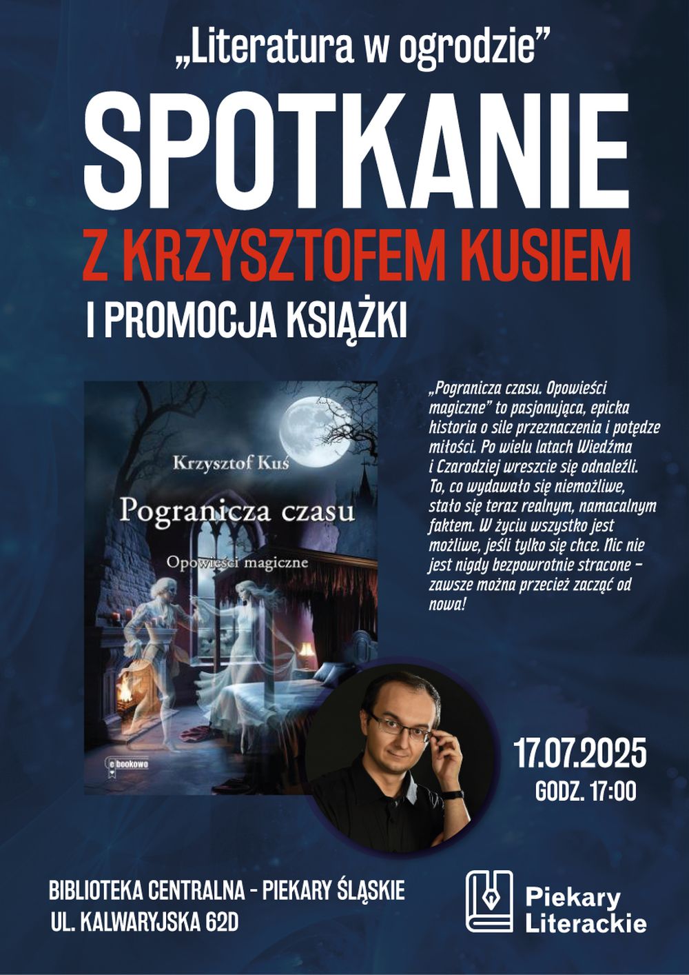 17 lipca o godz. 17:00 w ogrodzie Biblioteki Centralnej, znajdującej się przy ul. Kalwaryjskiej 62d, odbędzie się autorskie spotkanie z Krzysztofem Kusiem – twórcą niedawno wydanej książki „Pogranicza czasu. Opowieści magiczne”. To wydarzenie jest częścią cyklu literackiego „Piekary Literackie” i stanowi niepowtarzalną szansę na rozmowę z autorem, którego prace łączą realistyczne spojrzenie z elementami fantastyki.