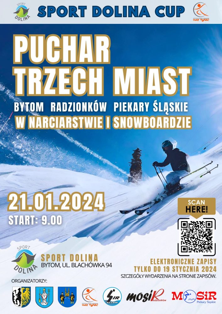 Miejski Ośrodek Sportu i Rekreacji w Piekarach Śląskich przy współpracy z Bytomiem i Radzionkowem wspólnie organizują zawody narciarsko-snowboardowe. Turniej odbędzie się 21 stycznia 2024 r. na stoku narciarskim Sport Dolina w Bytomiu-Suchej Górze przy ul. Blachówka 94. Zapisy na zawody przyjmowane są elektronicznie tylko do 19 stycznia 2024 r. Udział może wziąć każdy miłośnik zjazdów na nartach i desce, niezależnie od wieku i poziomu zaawansowania.